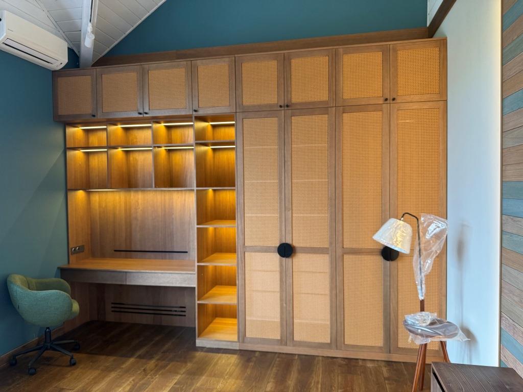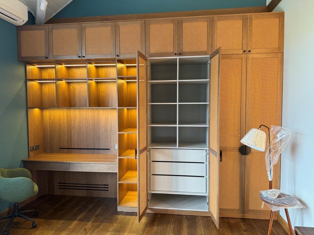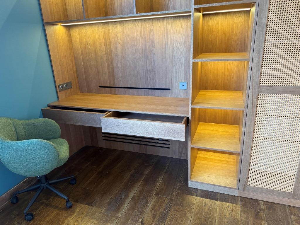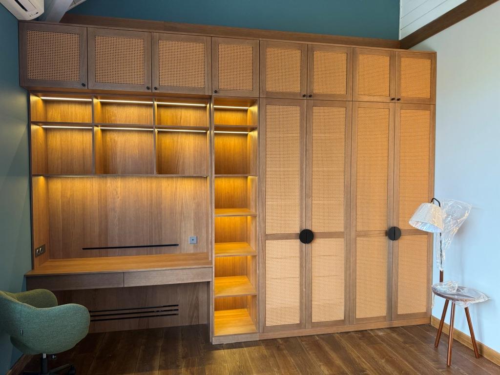 Комбинированный шкаф с рабочей зоной и подсветкой. Материал изготовления - шпон дуба, отделка - светлый орех, ротанг.