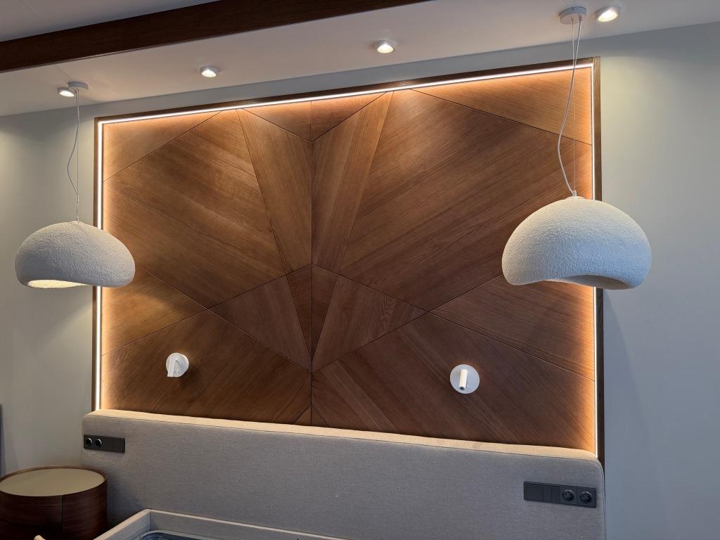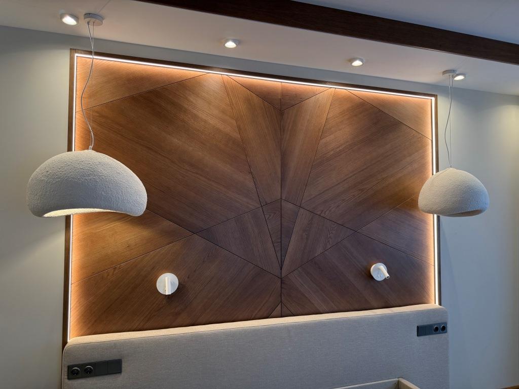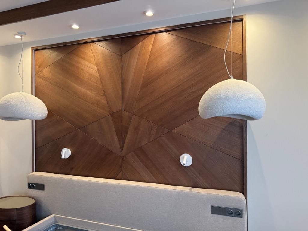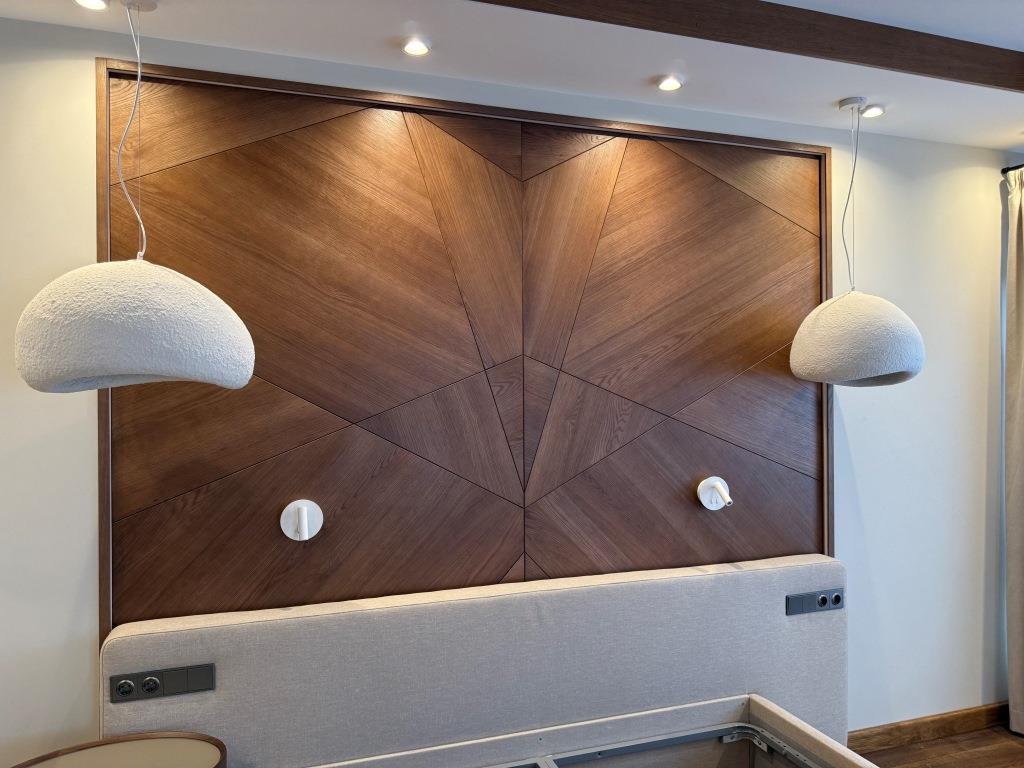 Декоративная стеновая панель в спальне, являющаяся изголовьем кровати. Выполнена из шпона дуба, с изометрическим рисунком.